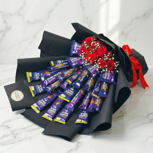 For the chocolate lover who deserves it all, this arrangement brings together the iconic taste of Dairy Milk and the timeless beauty of fresh blooms. Set against a clean marble backdrop, it’s a modern, sophisticated gift perfect for birthdays, anniversaries, or “just because” moments.