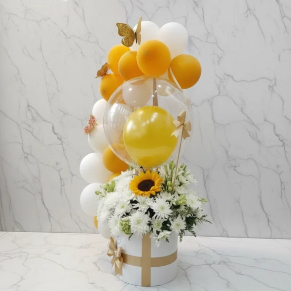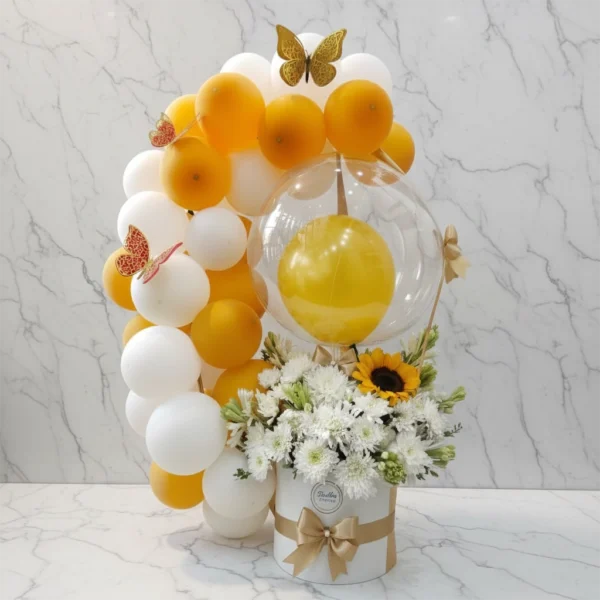 A radiant centerpiece featuring sun-kissed blooms and a striking floating globe, framed by a cascading arch of gold and white. This design brings a touch of sunshine to any room, making it the perfect choice for milestones and joyful celebrations.